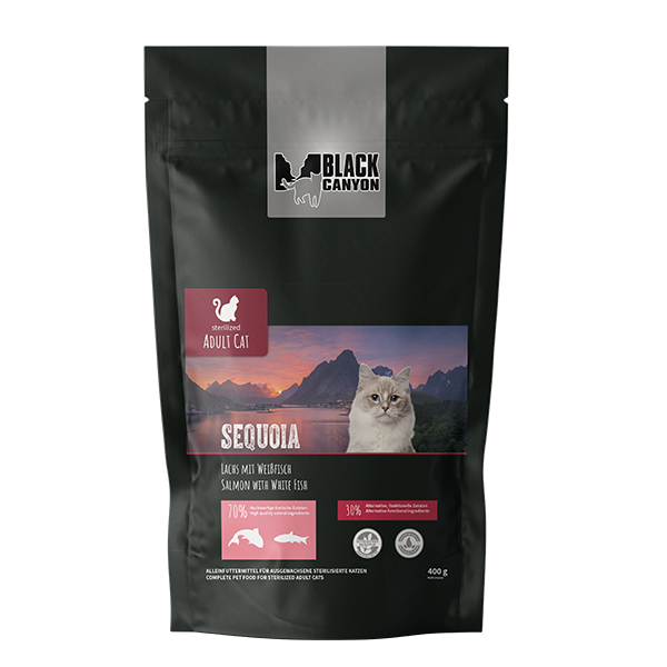 BLACK CANYON SEQUIOA - Lachs mit Weißfisch ist eine ideale Rezeptur für sterilisierte/kastrierte Katzen, Hauskatzen, zu Übergewicht neigende Katzen und ältere Katzen. Frischer Lachs und Weißfisch sind wichtige Bausteine für straffe Muskeln und beste Fitness. Der reduzierte Fettgehalt hilft deiner Katze dabei das Gewicht zu halten, während hochwertige tierische Proteine für eine gesunde Muskulatur und Fitness sorgen. Zellulose unterstützt die Reduzierung von Haarballen und Präbiotika verbessern die Nährstoffaufnahme im Darm.