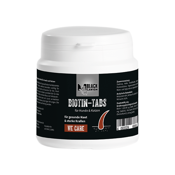 BLACK CANYON Biotin Drops enthalten hochdosiertes Vitamin H (Biotin), welches besonders wichtig für die Bildung von Keratin als Baustein für Fell, Haut und Krallen ist. Auch ist Biotin unentbehrlich für das Wachstum der Zellen und den Abbau von Fettsäuren.
