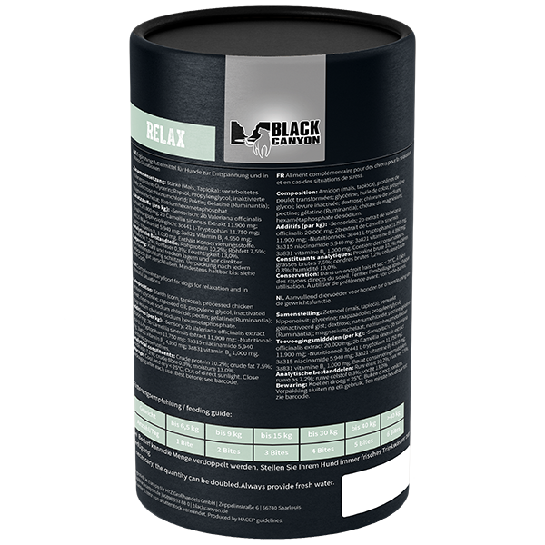 Die weichen BLACK CANYON we care RELAX bites enthalten L-Tryptophan, Baldrian, grünen Tee und Magnesium.