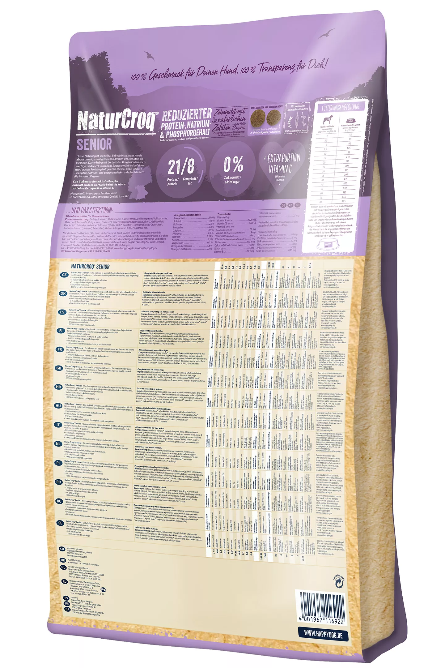 Daher haben wir bei der Entwicklung von Happy Dog NaturCroq Senior besonders hochwertige und leicht verdauliche Zutaten gewählt um den Darm zu schonen und auf einen moderaten Proteingehalt geachtet. Darüber hinaus ist diese Rezeptur mit überwiegend regionalen Zutaten, wie Geflügel und Vollkorngetreide, natrium- und phosphorreduziert und schont dadurch die inneren Organe. Wertvolle heimische Kräuter runden die leckere Rezeptur ab. Das Trockenfutter versorgt deinen Hundesenior mit allen wichtigen Nährstoffen die er für Vitalität und Lebensfreude im dritten Lebensabschnitt braucht.