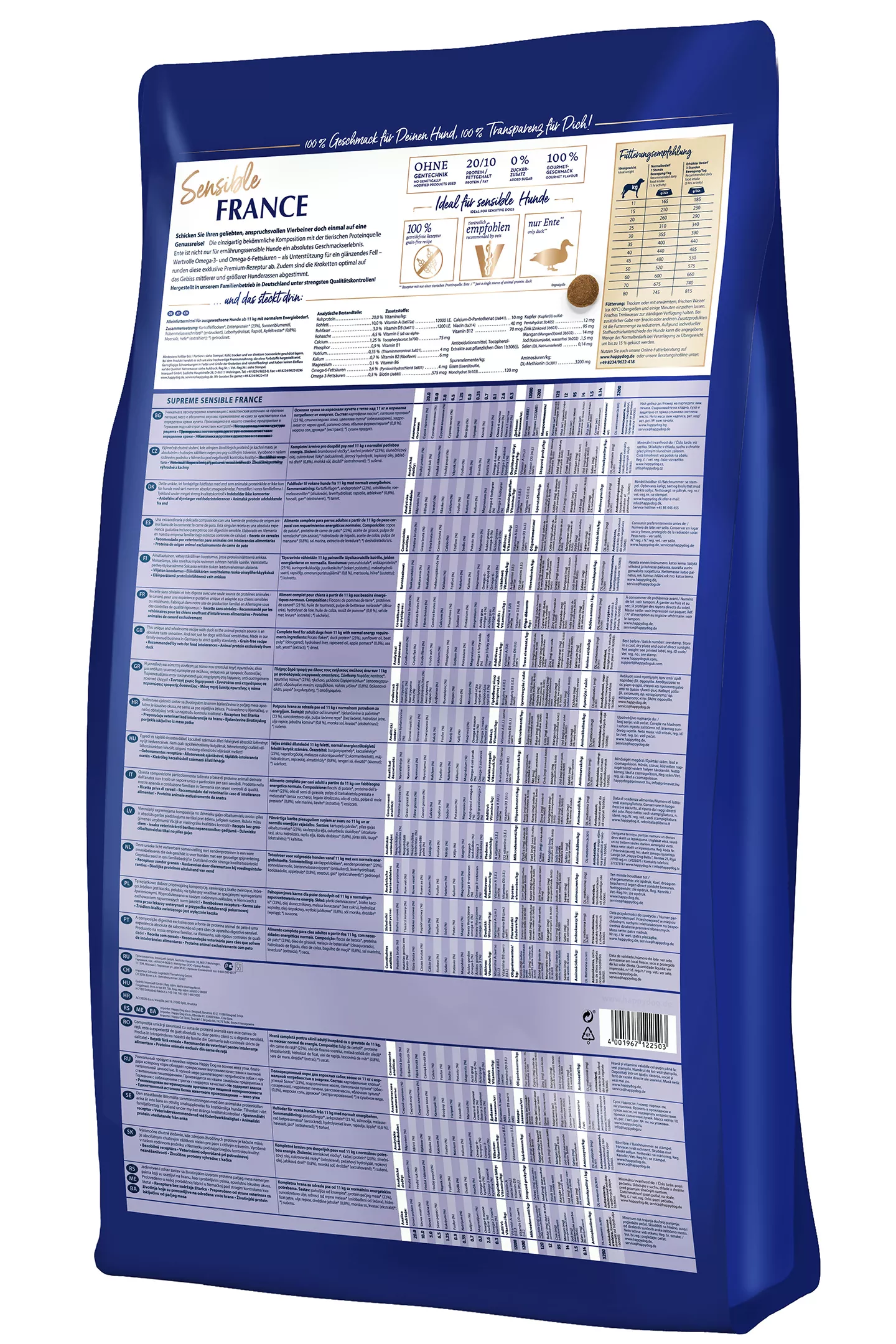 Du möchtest deinen Vierbeiner mit etwas ganz Besonderem verwöhnen? Oder hast eine ernährungssensible Fellnase zu Hause, die zu Verdauungsproblemen neigt? Feine Gourmet-Ente als einzige tierische Proteinquelle und glutenfreie Kartoffel begeistern selbst den sensibelsten Gourmet. Kartoffeln enthalten kein Gluten und sind für Tiere mit Getreideunverträglichkeiten geeignet. Ente als seltene und exklusive Proteinquelle zeichnet sich durch eine optimale Verträglichkeit aus. Wertvolle Omega-3 und Omega-6 Fettsäuren – wichtig für eine gesunde Haut und ein glänzendes Fell – runden die exklusive Rezeptur ab. Dies macht Supreme Sensible France zu einem ausgewogenen und idealen premium Trockenfutter für Hunde mit Allergien und Futtermittelunverträglichkeiten.