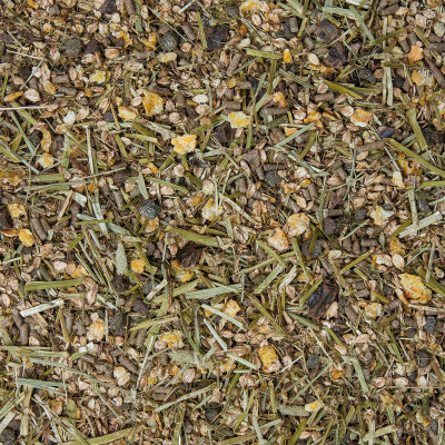 Gerstenflocken, Maisflocken, Sonnenblumenschalen, 8 % Luzerne, Sonnenblumenextraktionsschrotfutter, Weizenkleie, Johannisbrotschrot, 3 % Wiesen-Lieschgras (Timothy), Apfeltrester, Calciumcarbonat, Chicoréepülpe, Bierhefe, Leinöl, Gerste, Natriumchlorid, Monocalciumphosphat, Leinkuchen, Sonnenblumenöl, Magnesiumoxid