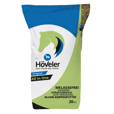 Original Höveler All In One bietet als strukturreiches Krippenfutter eine optimale Ergänzung zum üblichen Getreide. Durch den hohen Anteil an Strukturfasern, die aus gereinigtem Luzernheu und fruktanarmem Wiesenheu bestehen, wird die Kautätigkeit angeregt - eine unverzichtbare Voraussetzung für einen reibungslosen Verdauungsablauf. Bei mittlerem Gehalt an verdaulicher Energie, nur 3,8 % Zucker und einem reduzierten Stärkegehalt eignet es sich optimal für Freizeit- und Robustpferde - auch als alleiniges Krippenfutter. Es lässt sich in reduzierter Menge auch mit anderen Einzel- oder Mischfuttermitteln kombinieren und bietet so auch Sportpferden eine Rationsaufwertung mit Strukturfaser. Die wohl dosierte Zusammensetzung der Komponenten gewährleistet eine ausgeglichene Versorgung Ihres Pferdes mit allen Grundnährstoffen, Mineralstoffen und Vitaminen.