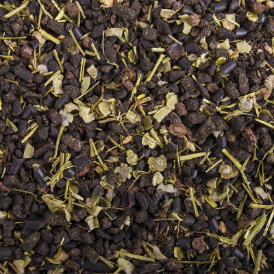 Sonnenblumenextraktionsschrot, 15 % Leinsamenschalen, Sonnenblumenschalen, 5 % Leinsaat getoastet gewalzt, 4,7 % Leinsaat, Leinöl , Erbsenflocken, Johannisbrotschrot, Leinkuchen, Sojaschalen, Sojaflocken, Natriumchlorid, Calciumcarbonat, Apfeltrester, Monocalciumphosphat, Inulin, Magnesiumoxid, Kokos, Bierhefe inaktiviert, 0,6 % Luzerne dehydriert