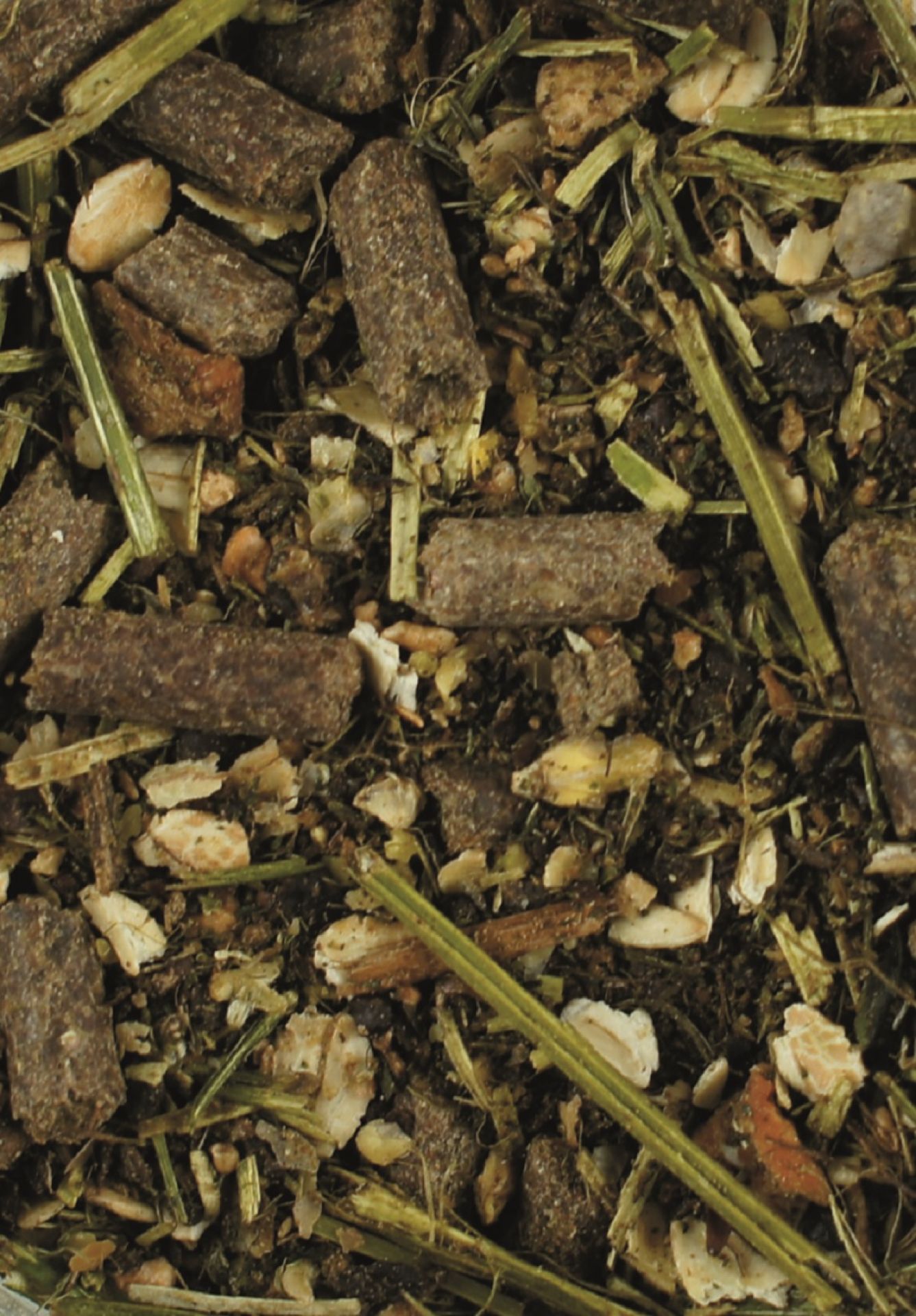 11,5 % Weizengrießkleie, 10,0 % Haferflocken, 8,0 % Maiskeime, 7,5 % Luzerne geschnitten, 7,0 % Hefe, 6,0 % Zuckerrübenmelasse, 5,0 % Leinexpellerfeinmehl, 5,0 % Leinextraktionsschrot, 5,0 % Apfeltrester, 5,0 % Sojaextraktionsschrot, 5,0 % Luzernegrünmehl, 3,0 % Biertreber, 1,7 % Mais, 1,5 % Rapsöl, 1,1 % Kohlensaurer Algenkalk, 1,0 % Leinöl, 1,0 % Johannisbrotschrot, 1,0 % Karottenwürfel, 0,8 % Zichorienpülpe, 0,5 % Monocalciumphosphat, 0,06 % Schafgarbenkraut, 0,06 % Fenchel, 0,05 % Anis, 0,05 % Kamillenblüten, 0,03 % Salbeiblätter, 0,03 % Tausendgüldenkraut, 0,02 % Süßholzwurzel, 0,01 % Kurkuma, 0,01 % Zimtrinde