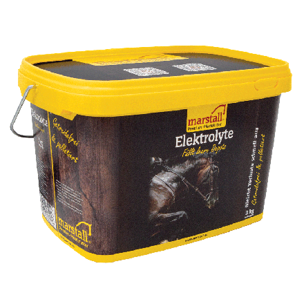 Bei Hitze oder starker Belastung wie intensivem Training können Pferde über 30 Liter Schweiß verlieren. Wie bei Durchfall werden dabei große Mengen Elektrolyte ausgeschwemmt. marstall Elektrolyte sind an allen Zellfunktionen beteiligt, regulieren den Wasserhaushalt des Körpers und den pH-Wert des Blutes und sind für Nerven- und Muskelfunktionen unentbehrlich. Bei hohem Verlust kommt es daher zu plötzlichen Leistungseinbrüchen, wenn die Elektrolyte nicht schnell ersetzt werden.