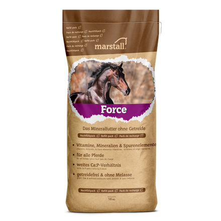 marstall Force ist ein besonders hochwertiges Mineralfutter für alle Pferde, egal welchen Alters, welcher Rasse und unabhängig von der erbrachten Leistung oder dem Einsatzgebiet. Unser marstall Force ist durch das weite Calcium-Phosphor Verhältnis bestens zum Ausgleich von reinen Heu-Getreide-Rationen geeignet, kann aber auch mit anderen marstall Futtersorten kombiniert werden. Dies ist insbesondere dann empfehlenswert, wenn das Pferd eine kleinere Menge als die jeweils empfohlene Futtermenge bekommt.