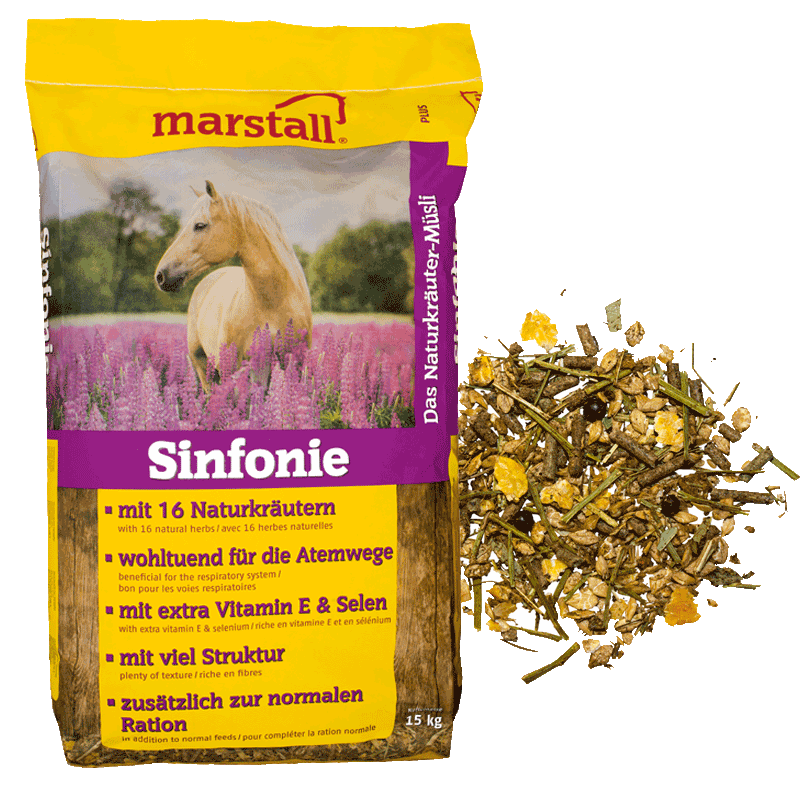 marstall Sinfonie ist ein Diät-Ergänzungsfuttermittel für Pferde zur Unterstützung der Vorbereitung auf sportliche Anstrengung und der Erholung von sportlicher Anstrengung. Generell wird empfohlen, vor der Verfütterung eines Diät-Ergänzungsfuttermittels den Rat eines Fachmannes einzuholen. Alle genannten Futtermengen sind über den Tag verteilt in mehrere kleine Gaben aufzuteilen. Unsere Empfehlungen gehen grundsätzlich von einem Raufutteranteil (Heu) von 1,5 kg je 100 kg Lebendgewicht und Tag aus.
