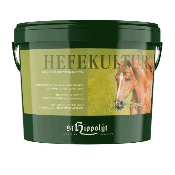 Das Mikrobiom ist die Gesamtheit aller Mikroorganismen, die auf und im Körper angesiedelt sind. Unter dem Begriff Darmmikrobiom ist das intestinale Mikrobiom zusammengefasst, welches aus Milliarden von Mikroorganismen besteht. Durch eine einseitige Futterration oder mangelnde Grundfutterqualität kann das empfindliche System gestört werden. In unserer Hefekultur sind hochbioverfügbare Mikronährstoffe für die enzymatische Verdauung mit Hefekulturen für den Aufbau des Dickdarmmikrobioms kombiniert. Ein stabiler Verdauungstrakt verbessert langfristig das Immunsystem, die Eigensynthese der Vitamine des B-Komplexes sowie eine effektivere Verdauung von Rau- und Weidefutter. Hefekultur ist besonders für schwerfuttrige und ältere Pferde, bei Verdauungsstörungen, im Fellwechsel, zur Förderung des Hufwachstums sowie für geforderte Sportpferde, Zuchtstuten und Fohlen zu empfehlen. "