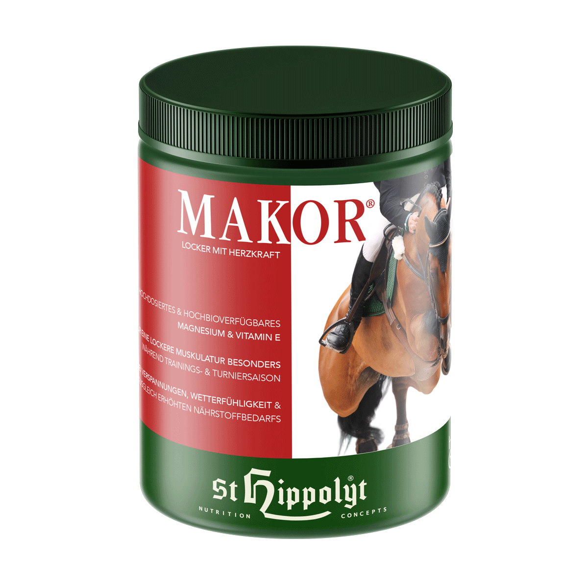 Bewährt hat sich Makor® in Zeiten erhöhter Trainingsintensität, bei Wettkampfeinsätzen, bei verspannten, ängstlichen Pferden, bei Stall- oder Klimawechsel, längeren Transporten, Trächtigkeit oder Geburt und in Stresssituationen."