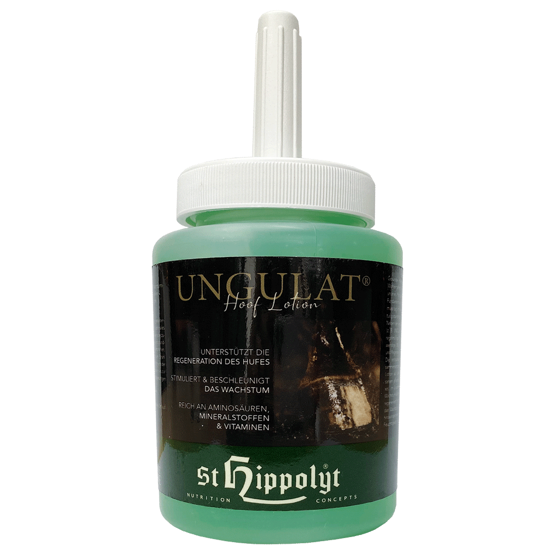 Gesunde Hufe sind essentiell für das Wohlergehen und die Lebensqualität unseres Pferdes. Sie sind das tragende Fundament und kein anderer Körperteil muss täglich einer solch enormen Belastung standhalten. Neben der bedarfsgerechten Fütterung (z. B. Ungulat® Hufkur) ist auch die regelmäßige Pflege der Hufe eine notwendige Maßnahme zur Vermeidung und Regeneration von Hufproblemen. Die innovative und hochwertige Zusammensetzung von Ungulat® Hoof Lotion auf der Basis eines hochwirksamen pflanzlichen Stammzellkomplexes, im Zusammenspiel mit kraftvollen Wachstumsfaktoren (Signalproteine), regeneriert Hufschäden und stimuliert das Wachstum des Hufhorns.